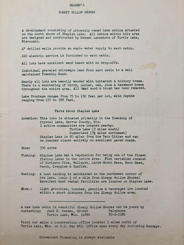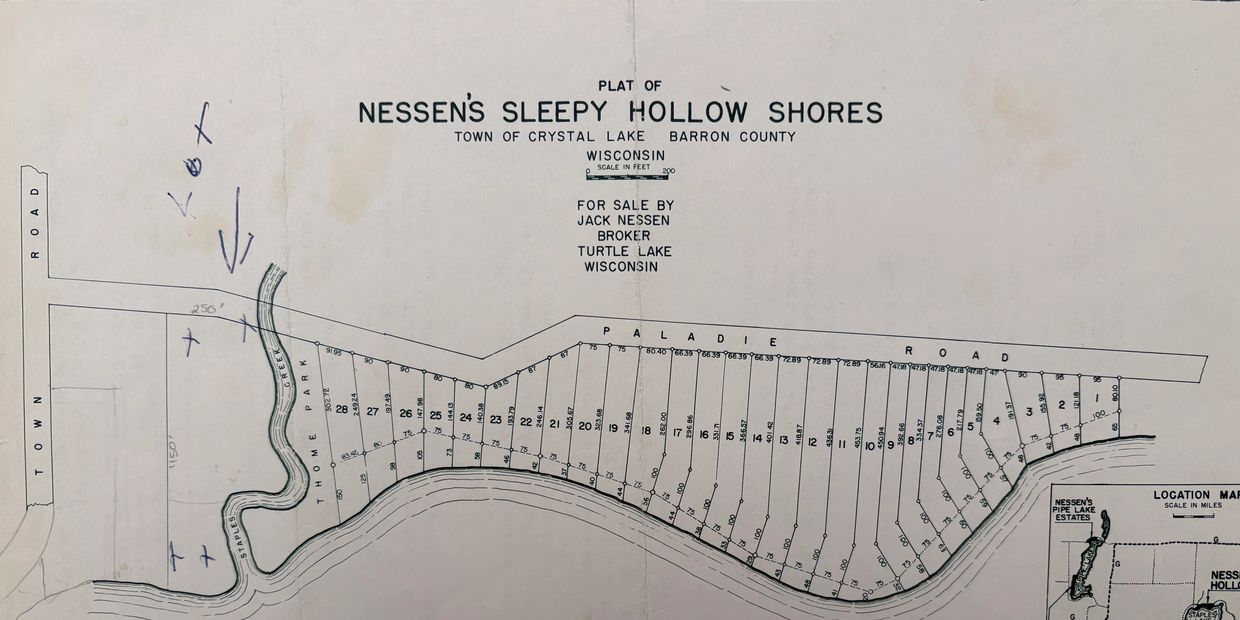 One of the earliest known developments was Nessen’s Sleepy Hollow Shores, located along the north shore of the lake. Records and original plat maps show that cabins were designed and constructed by Nessen Lakeshore of Turtle Lake, Wisconsin.